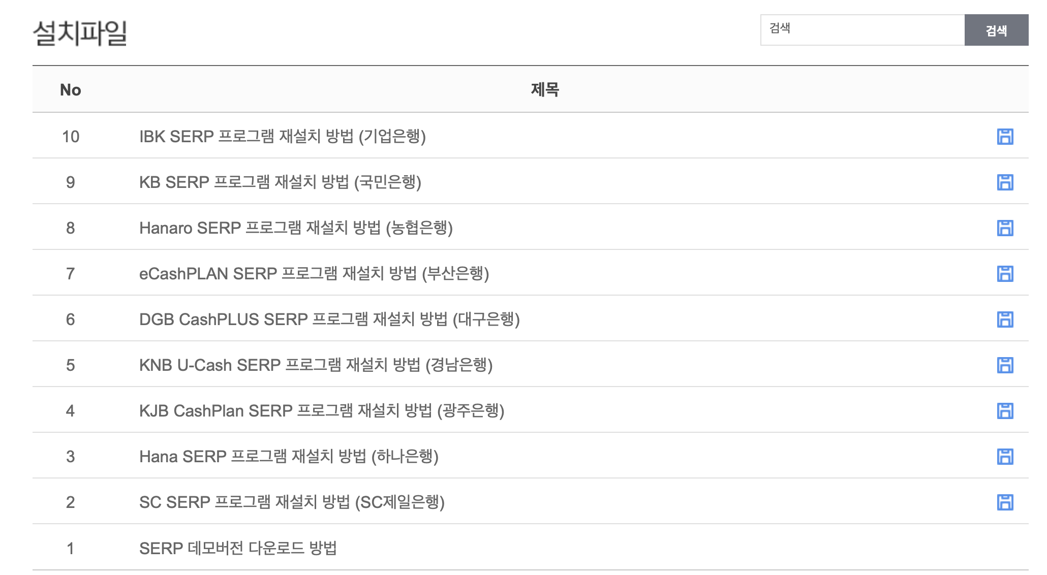 그외에도 국민은행, 농협은행, 부산은행, 대구은행, 경남은행, 광주은행, 하나은행 , SC제일은행 등 SERP 프로그램을 다운로드 하실 수 있습니다.