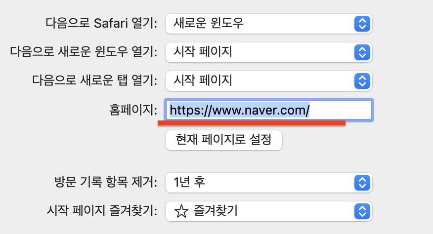 그리고 홈페이지에 애플이 설정된걸 네이버로 변경해주세요. 네이버 페이지 상태에서 해당 설정을 들어가셨다면 현재 페이지로 설정을 눌러주시면 됩니다.