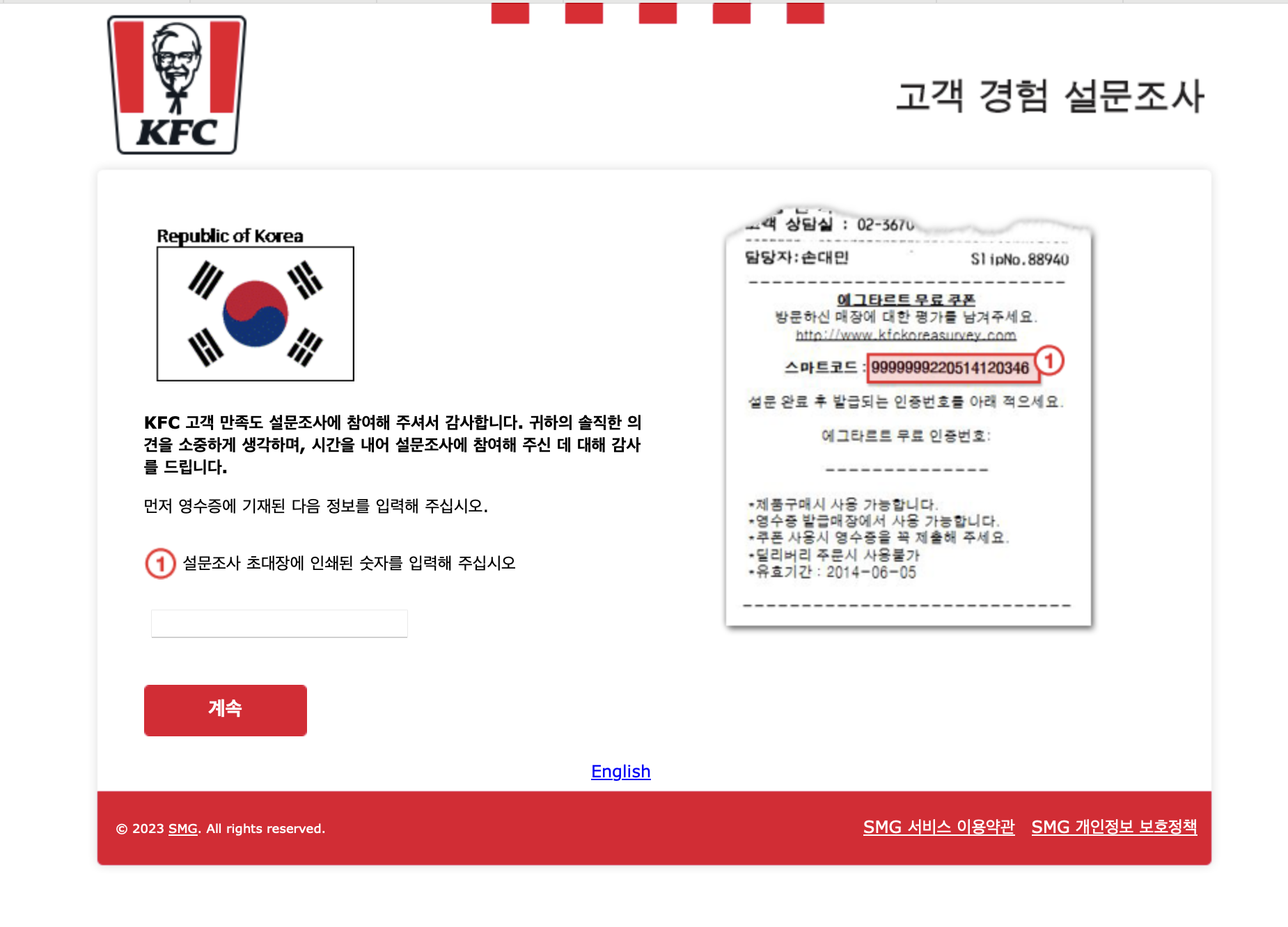 KFC 매장을 방문하신 뒤 제품을 구매하시면 받는 영수증을 잘 보세요.